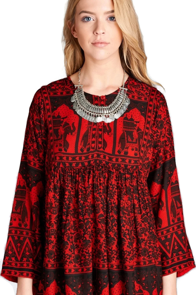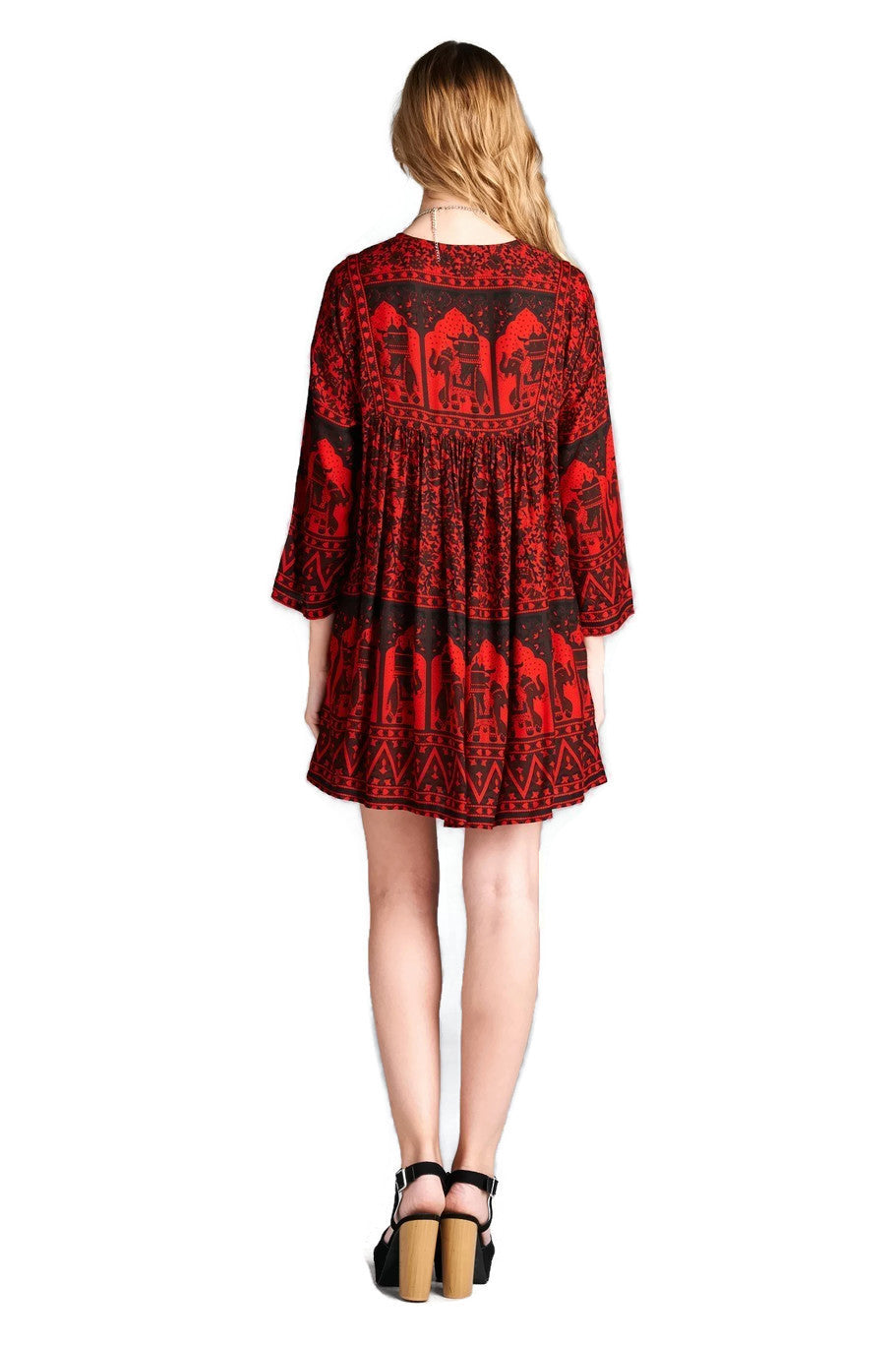 This India Elephant dress dress features a round neckline, 3/4 sleeves, a high waist and an A-line mini silhouette.
