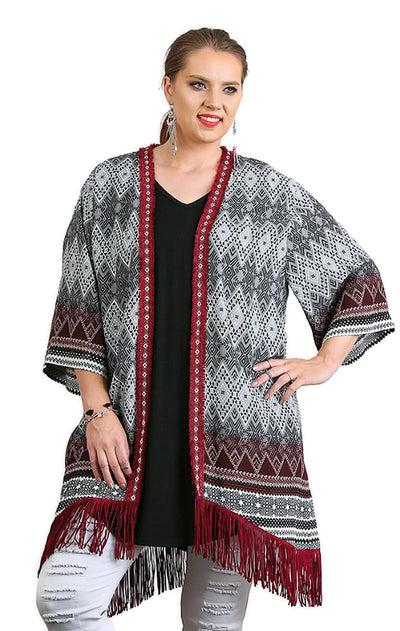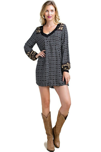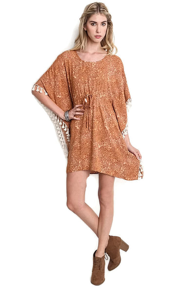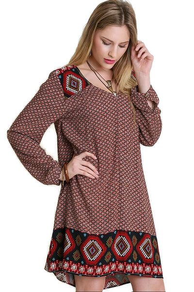 Border Print Lace up Tassel Tie Dress, Burgundy