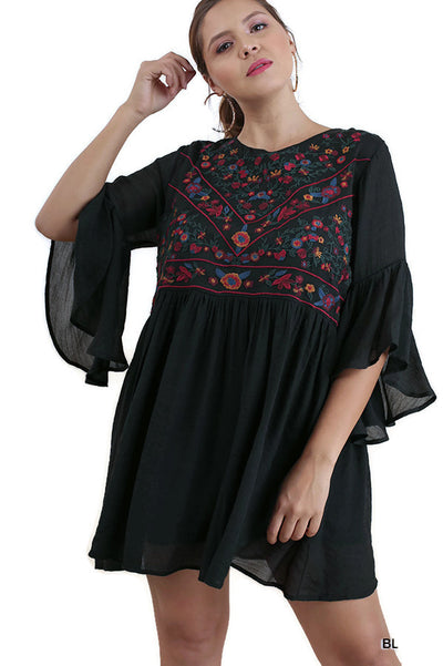 Floral Embroidered Bell Sleeve Dress, Black