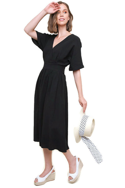 Surplice Cotton Midi Dress, Black