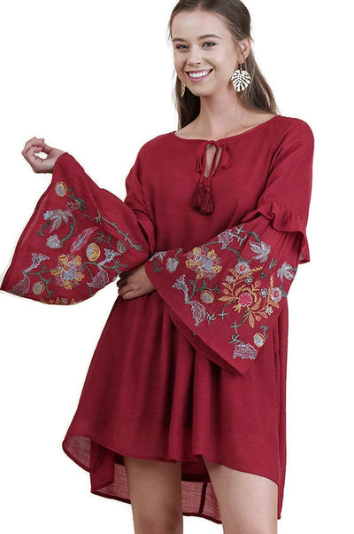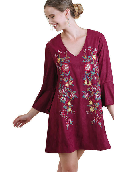 Floral Embroidered Bell Sleeve Dress, Wine