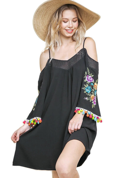 Floral Embroided Pom & Tassel Mini Dress, Black