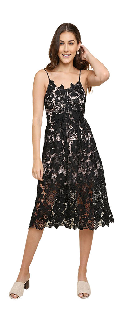 Floral Lace Applique Midi Dress, Black
