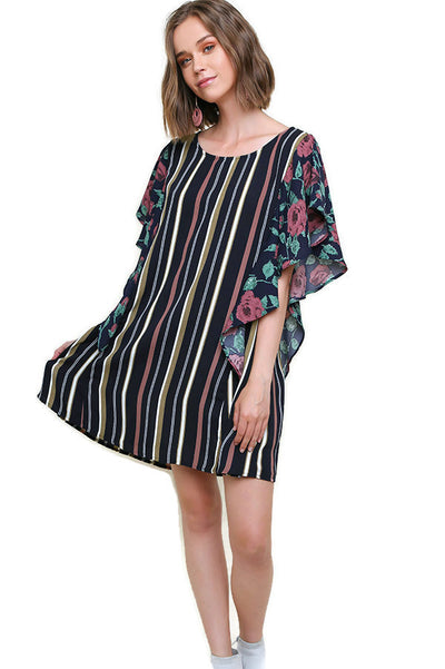 Striped & Floral Ruffle Sleeve Dress, Navy Mix