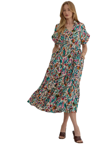 Floral Abstract Tiered Midi Dress, Camel