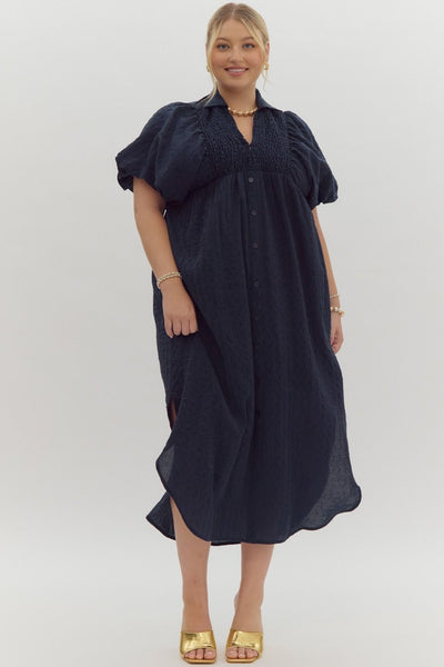 Textured Puff Sleeve Midi Dress, Navy