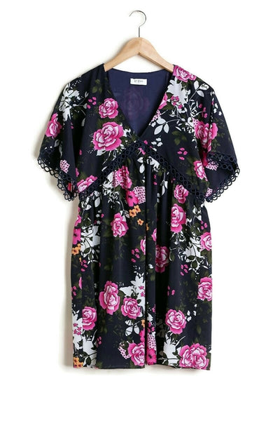 Floral V-Neck Crochet Detail Dress, Navy