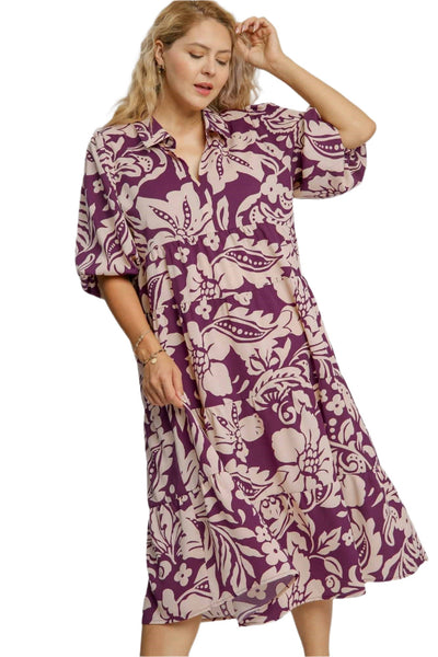 Two Tone Floral Print Midi Dress, Plum