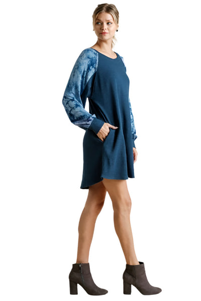 Tie Dye Raglan Sleeve Waffle Knit Mini Dress, Blue