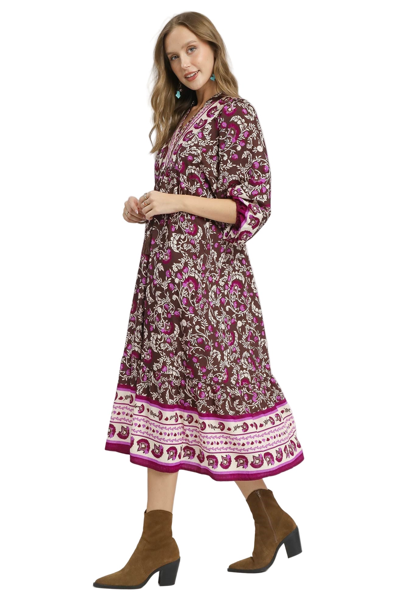 Step into easygoing elegance with this Border Print Floral Midi Dress. Its bohemian-inspired floral print adds a trendy, artsy touch while the flowing midi length keeps it casual and comfortable. Perfect for day-to-night wear, this versatile dress pairs effortlessly with heels, sandals or boots, making it a chic staple for your wardrobe adventures. Feel playful and stylish wherever you go!