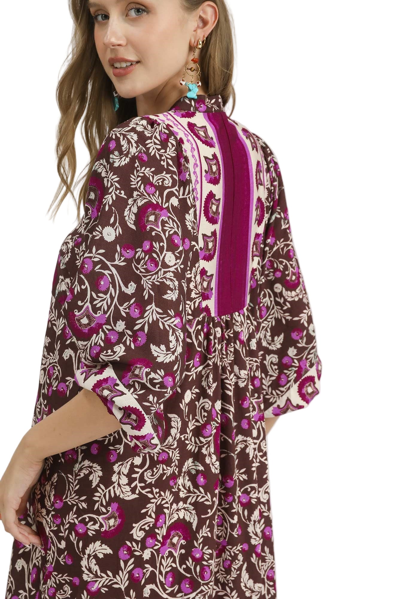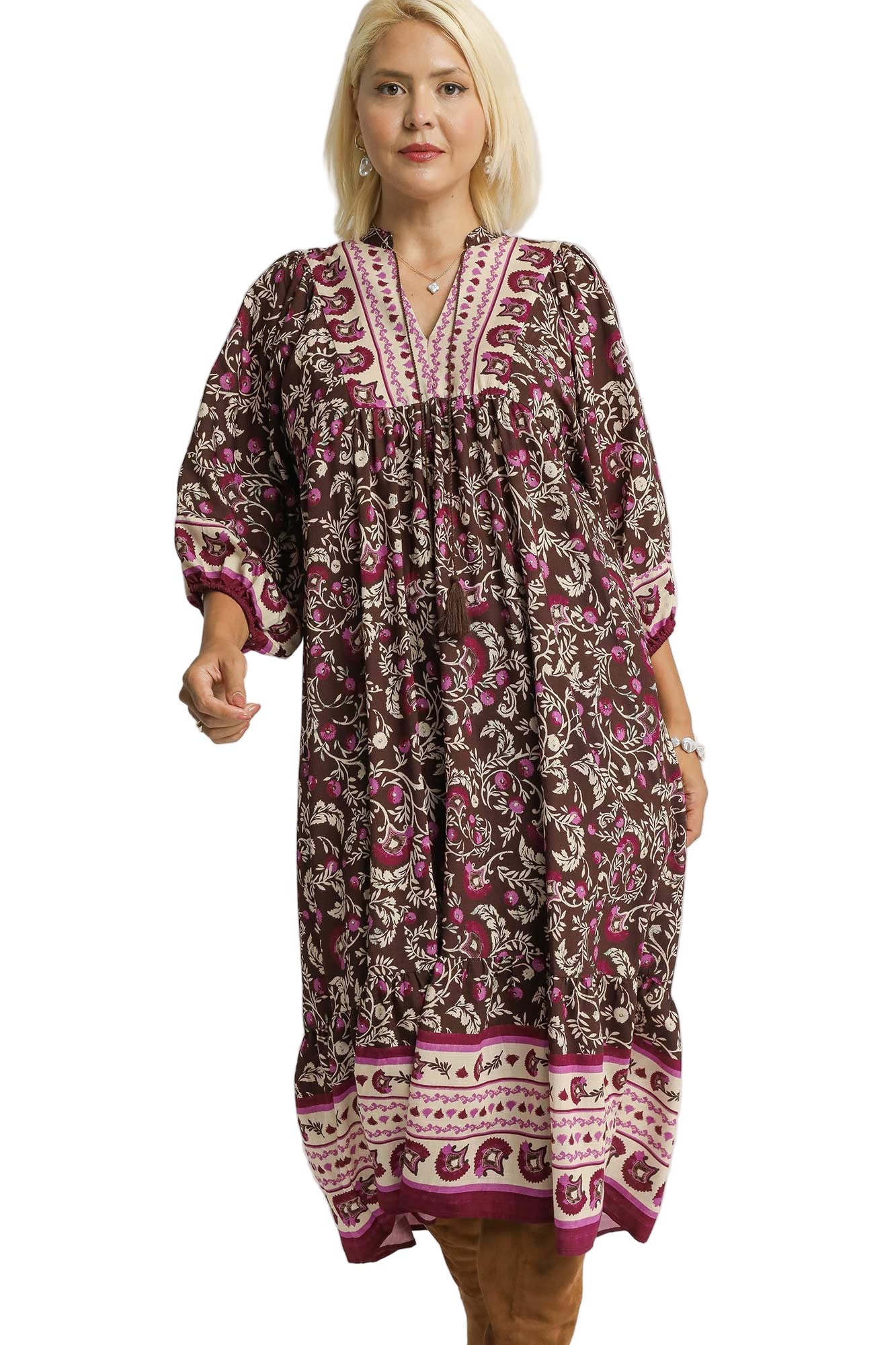 This dress features a V-neckline, tassel ties, 3/4 length balloon sleeves, tiered midi length, border print, is light weight and has a loose and flowy silhouette.- Small Bust 40" Length 47" : Medium Bust 42" L 47"