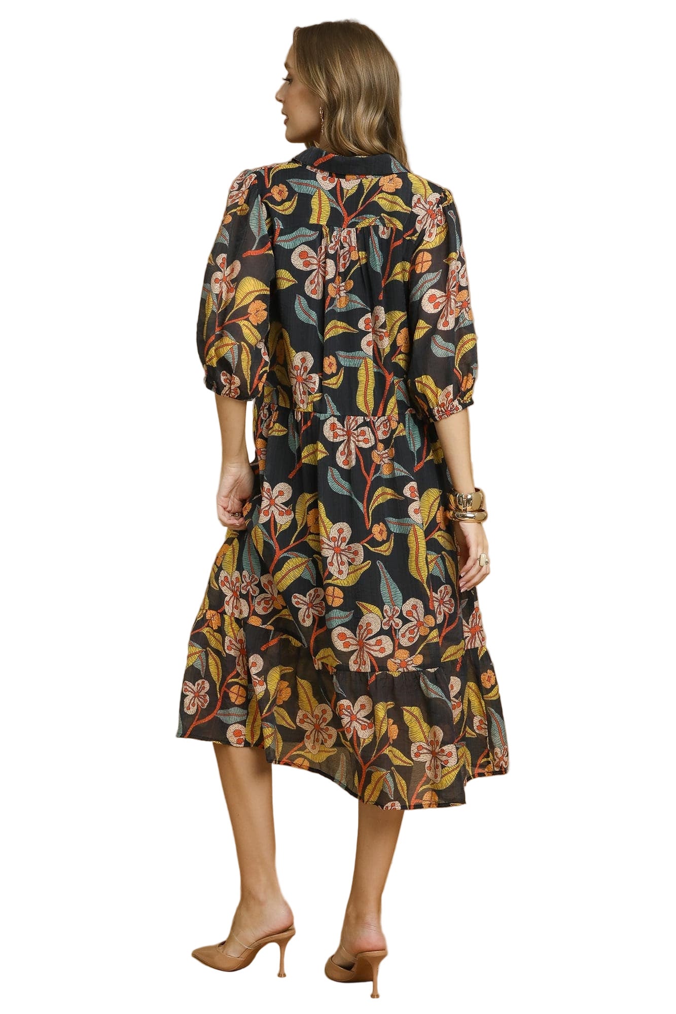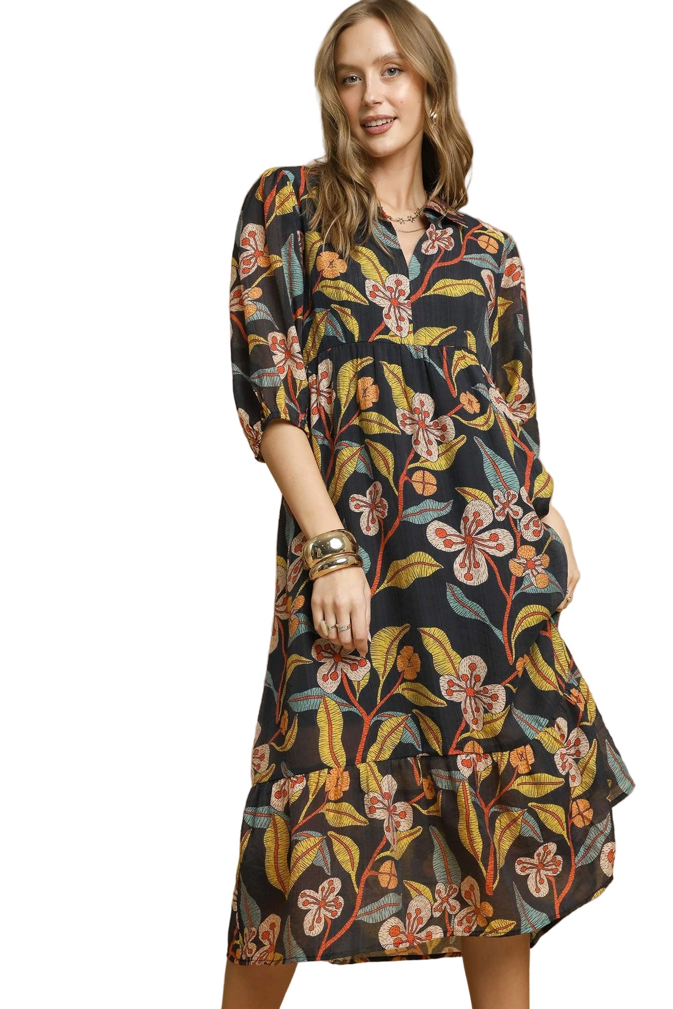 This dress features a V-neck with collar, 3/4 length sleeves with elastic cuffs, is lined & lightweight and has a tiered a-line midi silhouette.- Small Bust 38" Length 47" : Medium Bust 40" L 47"