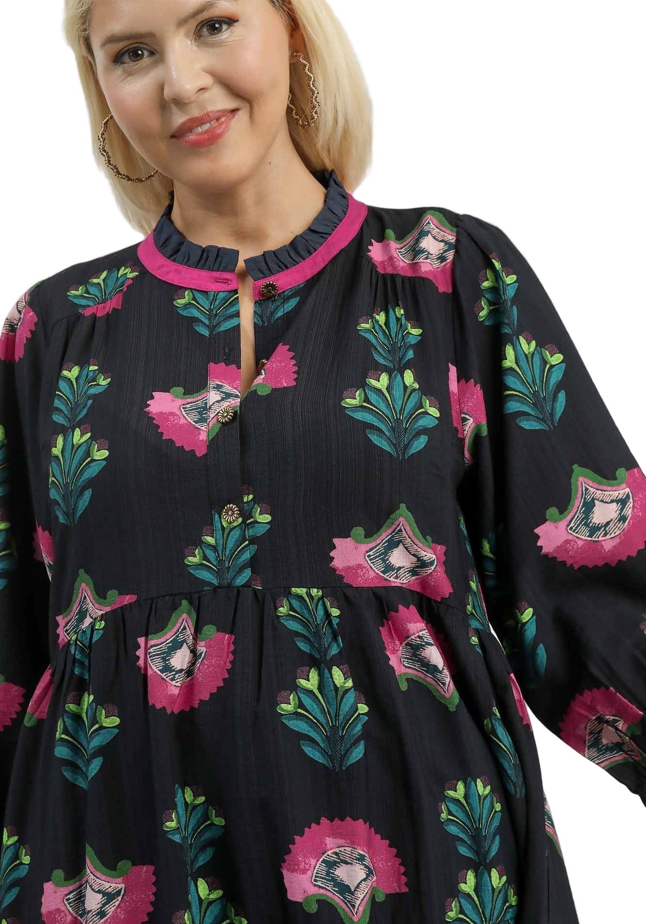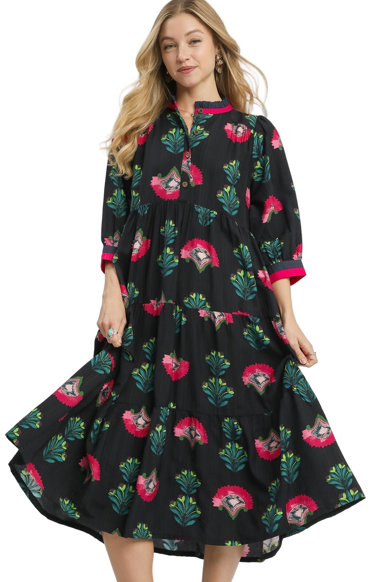 This dress features a round neck with ruffle trim,  3/4 length sleeves,  a partial button front with gold-tone flower buttons, contrast trim and has a tiered a-line midi silhouette.