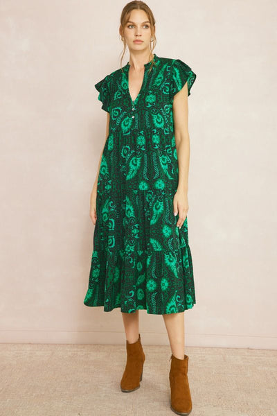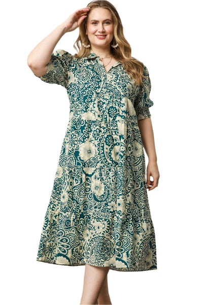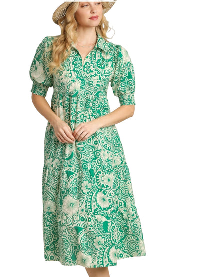 Floral Print Collared Midi Dress, Green