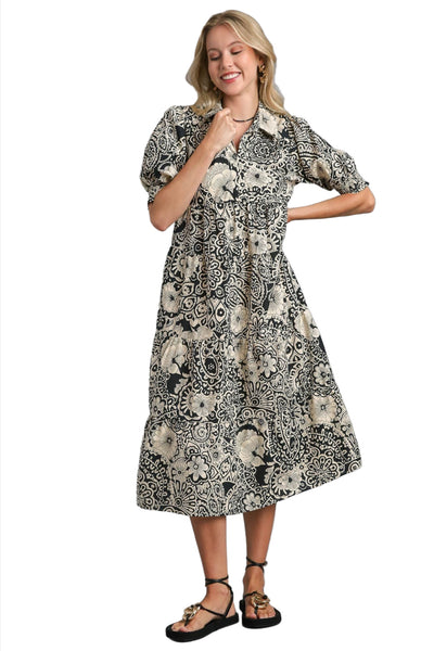 Leaf Print Tiered Midi Dress, Black