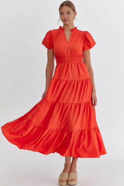 Bubble Sleeve V-Neck Tiered Dress, Red