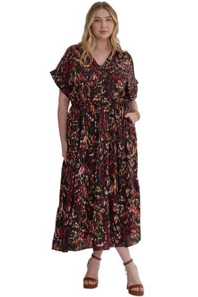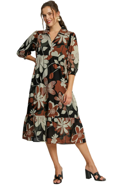 Floral Abstract Tiered Midi Dress, Rust