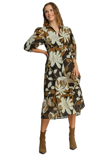 Floral Abstract Tiered Midi Dress, Camel