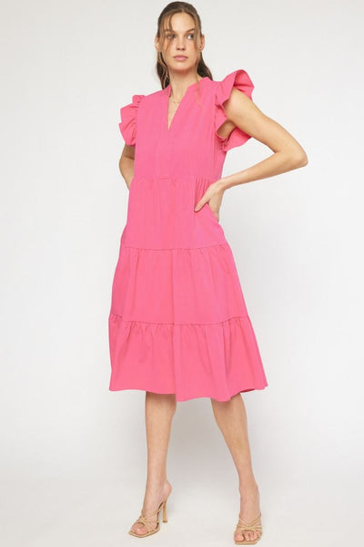 Ruffled Pocket Tiered Midi Dress, Hot Pink