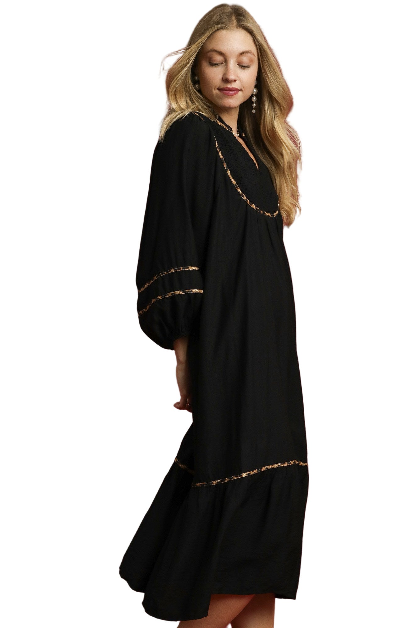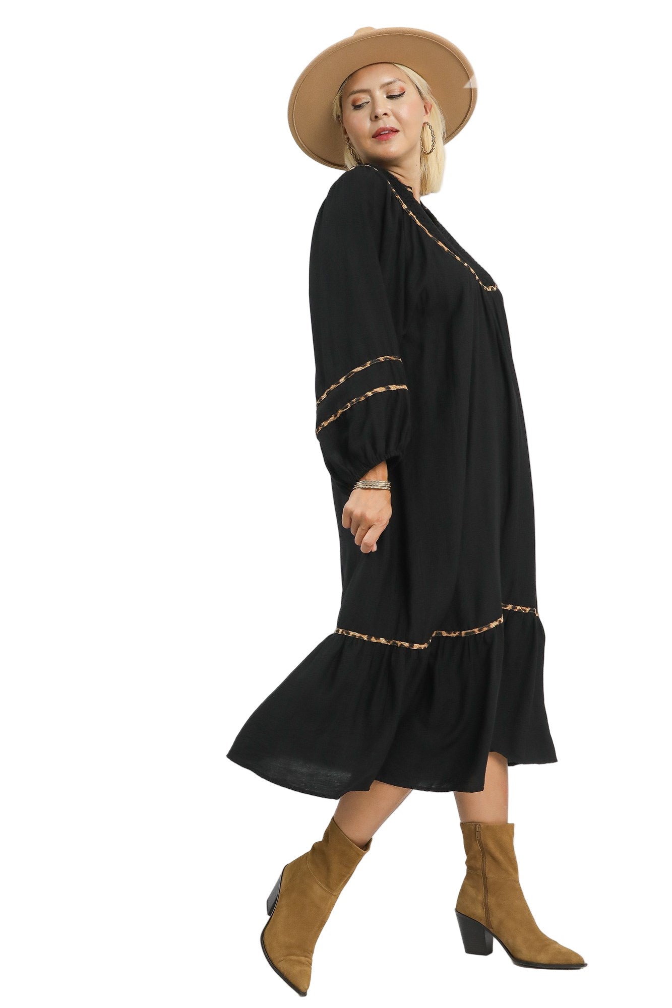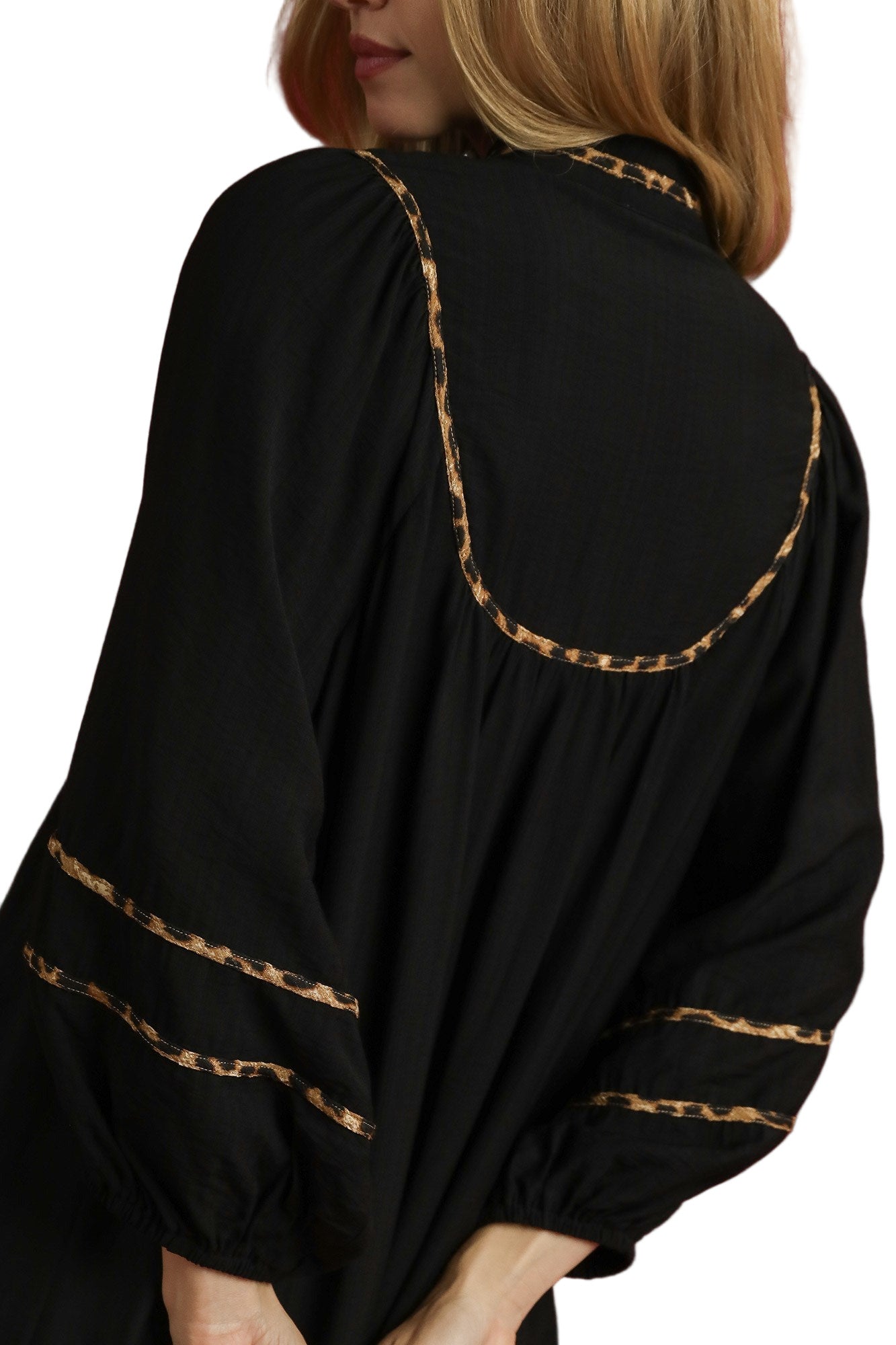 Embrace effortless boho vibes with this chic black maxi dress, featuring a chic leopard trim that adds a trendy edge. The smocked yoke ensures a comfortable, flattering fit, while the flowing silhouette makes it perfectly versatile for day-to-night styling. Whether you’re headed to brunch or a moonlit stroll, this dress brings easygoing elegance with a fun, fashionable twist.