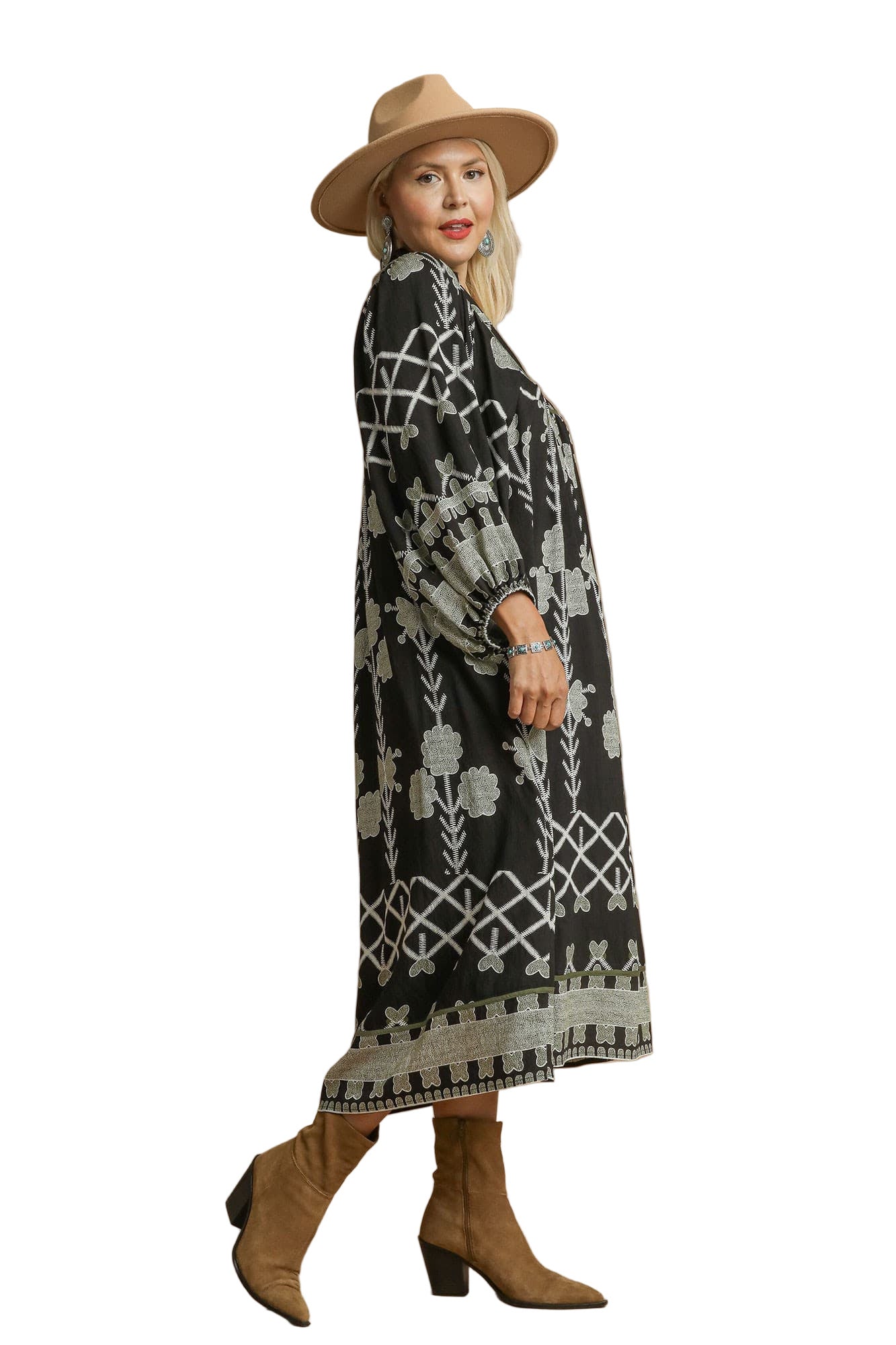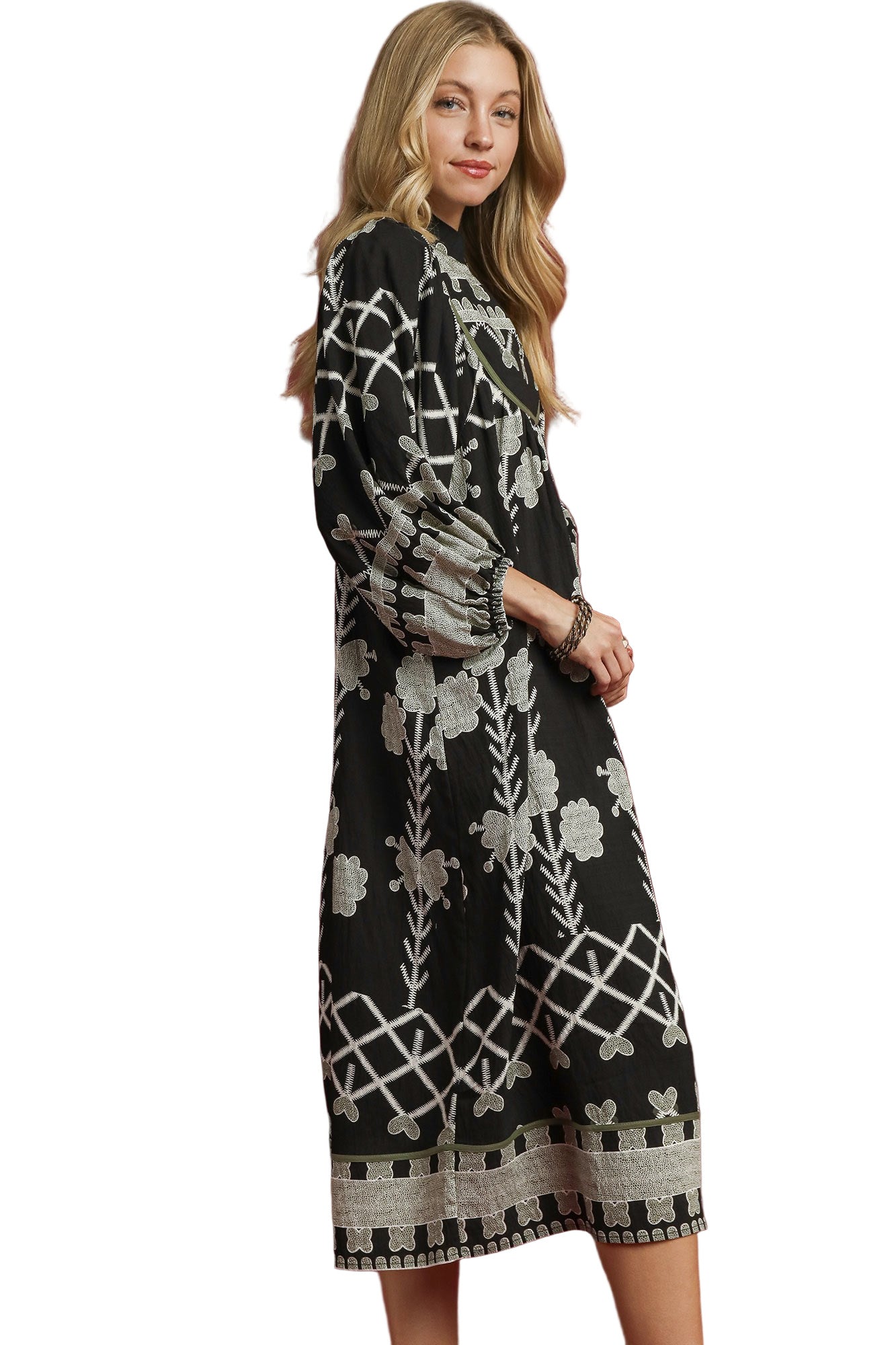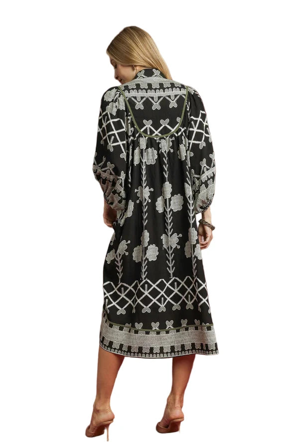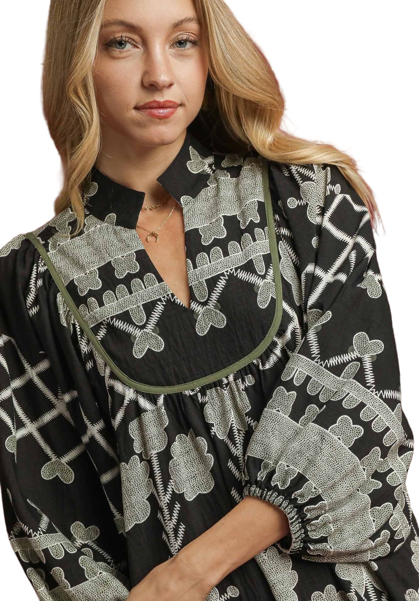 This dress features a split V-neck with collar, puff sleeves with elastic, olive piping and has an a-line midi silhouette.- Small Bust 42" Length 47" : Medium Bust 44" L 47"
