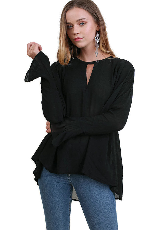 This top will take you from work to play. It features a long sleeve with ruffle at the wrist, a high low hemline, a keyhole neckline with button, pleats front & back, is light weight and has an a-line silhouette.