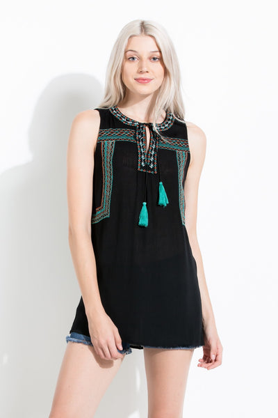 Aztec Embroidered Sleeveless Top, Black