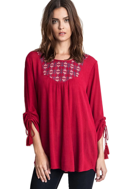 Embroidered Baby Doll Top, Burgundy