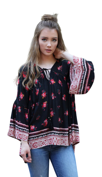 Floral Print Peasant Top, Black & Red