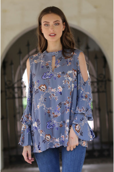 Jaquard Keyhole Cold Shoulder Top, Blue-Grey
