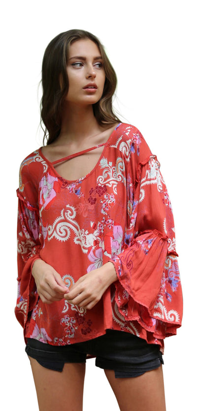 Floral Ruffle Seam Bell Sleeve Tunic, Watermelon