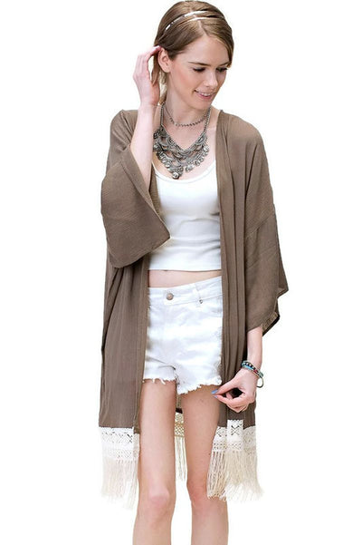 Bohemian Crochet & Fringe Kimono Jacket, Olive