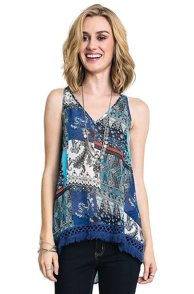 Tie Dye Slub Knit Tank Top with Lace Up Sides, Blue