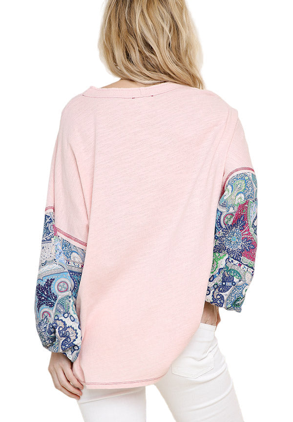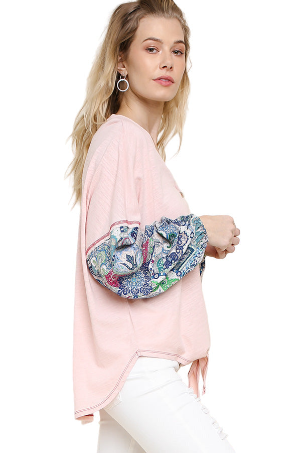 - Paisley Puff Sleeve V-Neck Knotted Top