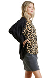 This top features a scoop neckline, long solid balloon sleeves with leopard cuffs, side slits, a high low scoop hemline and a wild leopard print.