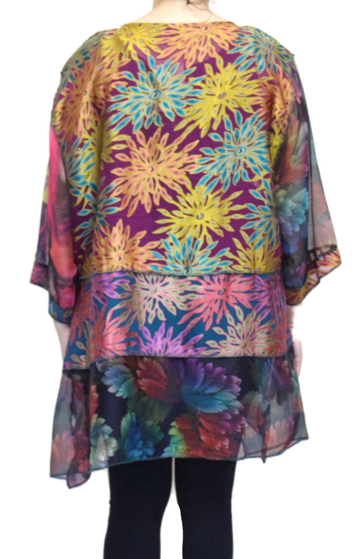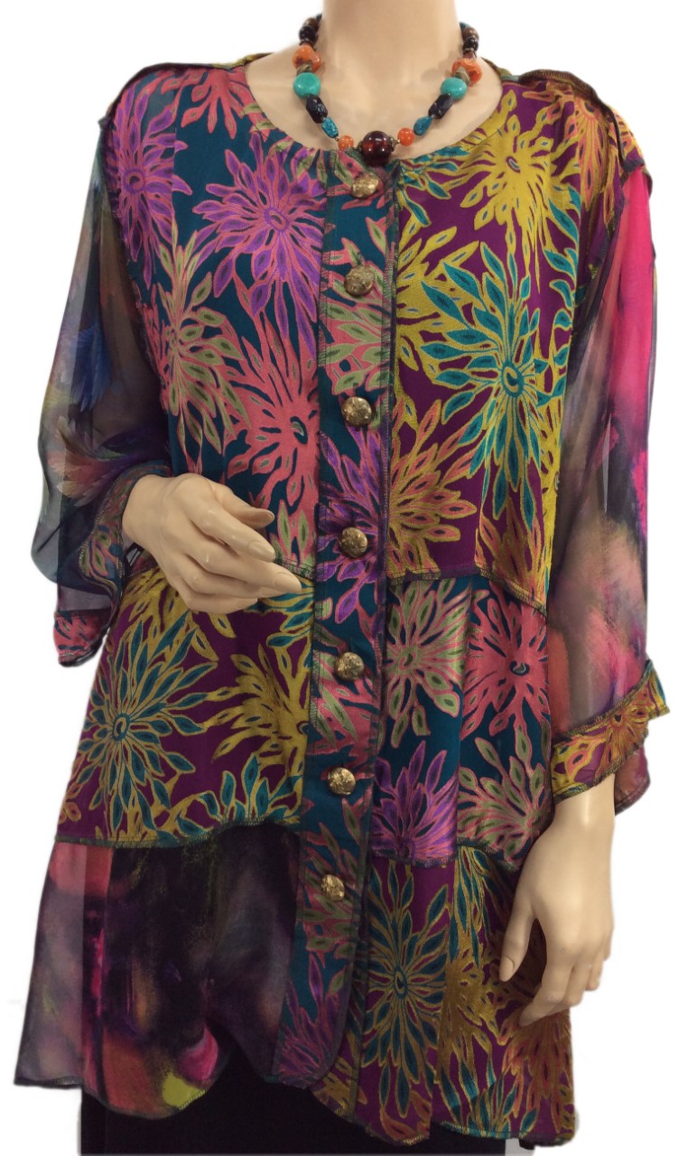 Art to wear that transitions effortlessly from day to night. This floral burnout Short Happy Jacket combines lightweight fabric with chic design details—button-front closure, asymmetrical hemline, and an elegant a-line silhouette. One-size versatility fits a range of sizes. Gorgeous buttons and unique pattern placement make each piece one-of-a-kind. Perfect for layering over dresses, tanks, or worn solo for understated sophistication.