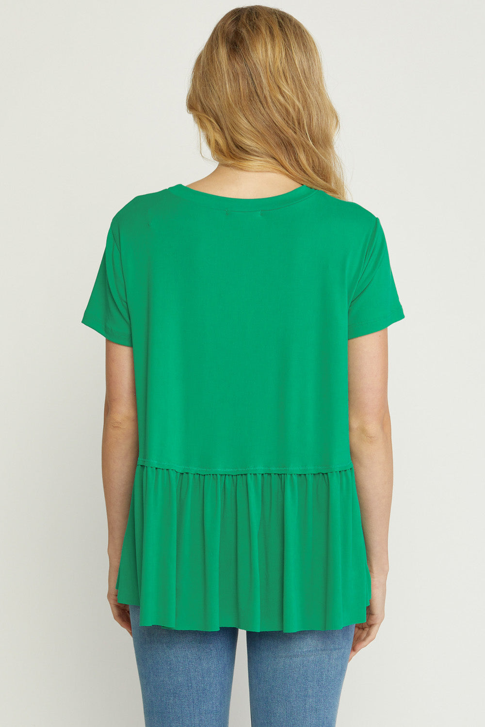 It features a round neckline, short sleeves, a peplum at the hem, is light weight and has an oversize silhouette. Pair this tunic with jeans and flats for a casual chic look!